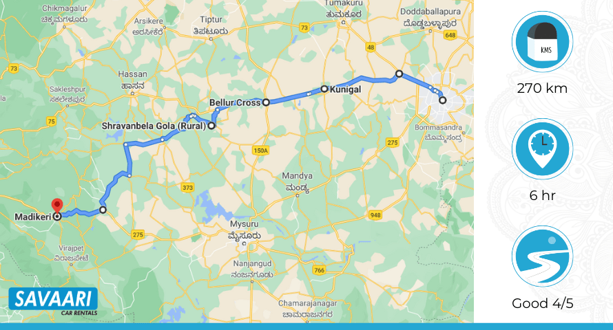 | Bangalore – Nelamangala – Kunigal – Bellur Cross – Sravanabelagola – Holenarasipur – Kushalnagar – Coorg |