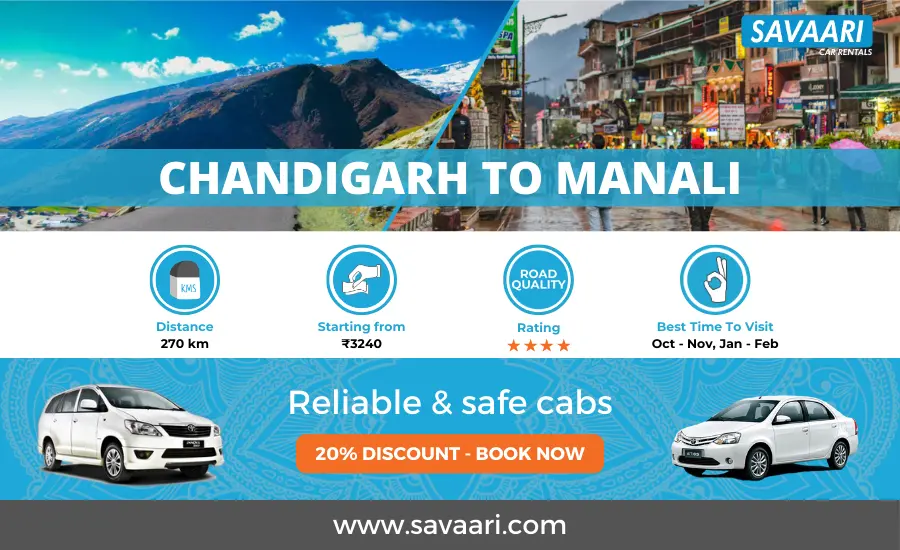 Manali is often and best explored from the nearest metro city of Chandigarh, therefore making this a popular road trip route for travellers. By booking a cab with Savaari, you can turn your road trip into an exciting journey and include experiences that you otherwise wouldn’t when travelling by bus or train. Book a Chandigarh car rental for the best experience on your effortless journey to Manali from Chandigarh by road and other means of travel.