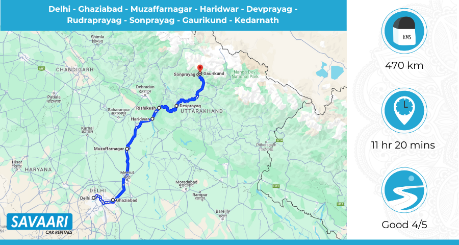 This is the fastest route to travel from Delhi to Kedarnath and is used by most travellers. This route has standard highway tolls, and the road conditions are better since there are no road closures. While travelling by taxi, you can also consider booking Savaari’s Delhi tempo traveller service for the added comfort of larger groups.