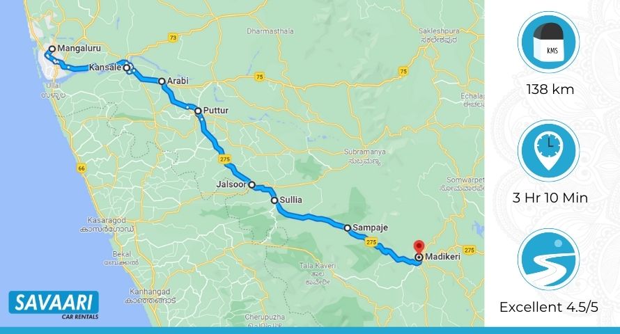 Route 2: Distance and time taken from Mangalore to Coorg via NH 66 & NH 275