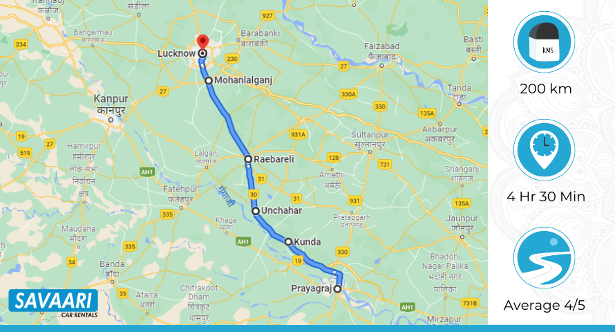 The Allahabad to Lucknow distance by road varies between 200 and 261 Km. You can also travel from Prayagraj to Lucknow by bus. Traveling from Allahabad to Lucknow distance by bus takes around 5-6 hours, with services provided by UPSRTC and other private players. Buses usually depart from Civil Lines or Leader Road in Prayagraj and arrive at Alambagh or Charbagh bus stands in Lucknow. You can hire a car rental in Lucknow with Savaari to reach your hotel or any other destination, riding comfortably in chauffeur-driven cars.