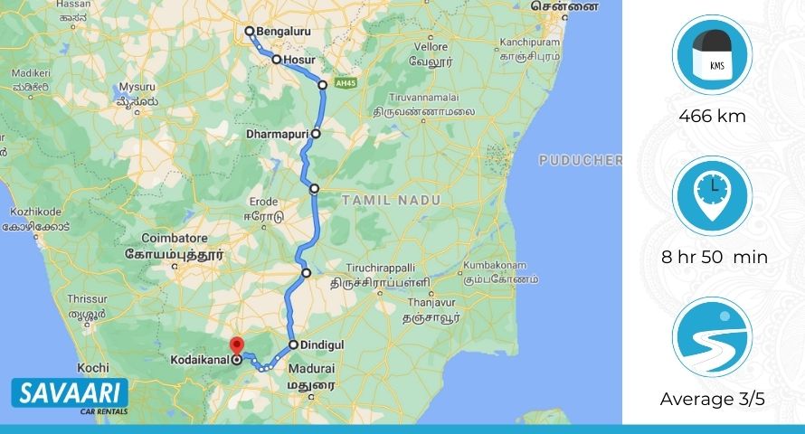 This is the shortest and the best route to travel between Bangalore and Kodaikanal. It is also the fastest, because the Bangalore to Kodaikanal traffic on this route is very minimal and there are no road closures as of April 2021. The distance between Bangalore and Kodaikanal on this route is somewhere around 466 KM and takes roughly 9 hours. Always check live maps and instant traffic updates for the latest information on Bangalore to Kodaikanal road conditions.