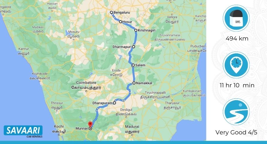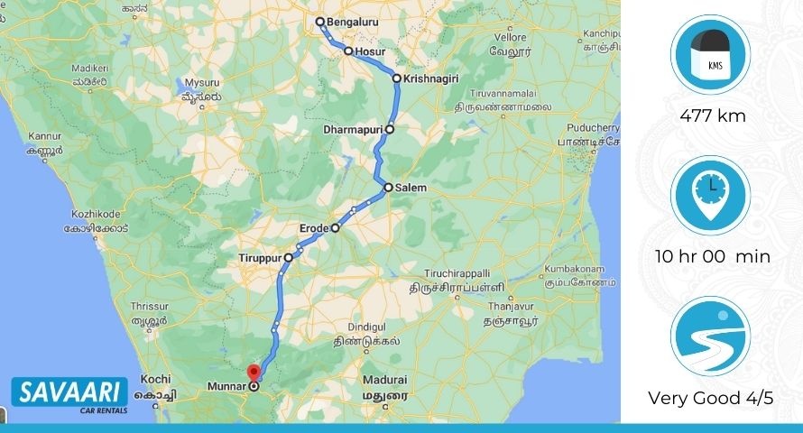 | Bangalore – Hosur – Krishnagiri – Salem – Erode – Tiruppur – Munnar |