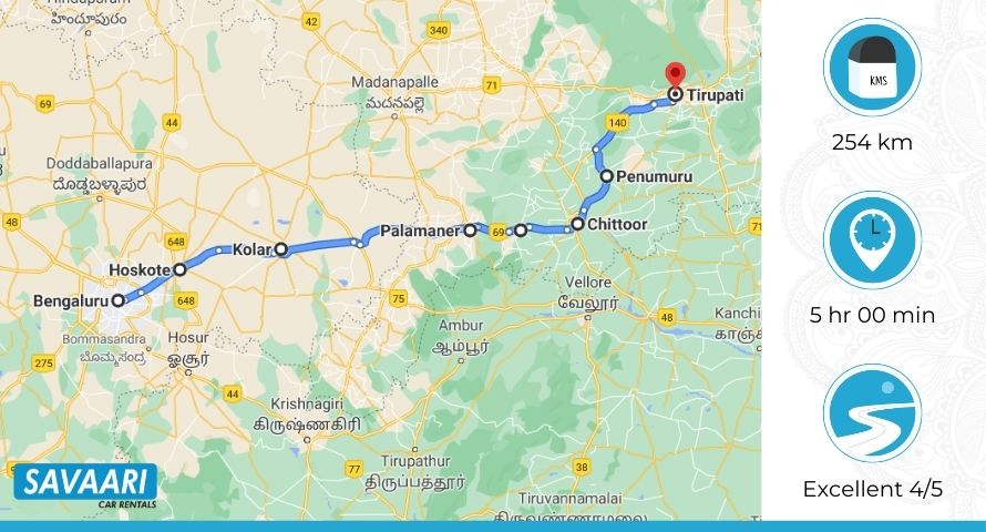 Via this route, the Bangalore to Tirupati by road distance is 264 KM. You will also not find much Bangalore to Tirupati via Chittoor traffic on this route. However, always check for live traffic updates and use real-time maps to get a better idea of the road conditions.