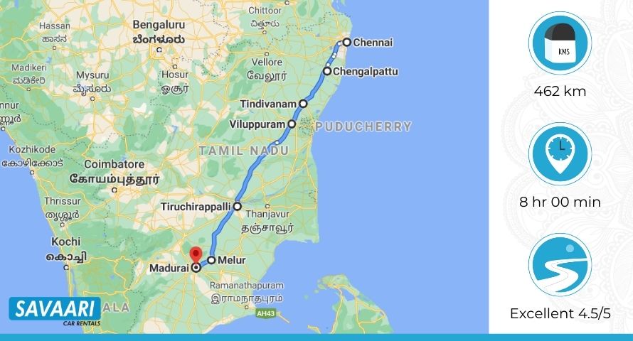 This is the shortest, fastest, and the most convenient route to cover Chennai to Madurai by road distance. Most tourists and frequent travelers use this route, since the traffic is also not heavy on this highway. The Chennai to Madurai distance is approximately 460 KM and takes nearly eight hours to travel. Before you travel, always check for traffic updates and use live maps to get the real-time information on Chennai to Madurai road condition.