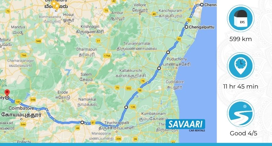 You can most probably expect regular Chennai to Ooty traffic, but no severe congestion or road closures. Here’s a basic Chennai to Ooty road map for this route: