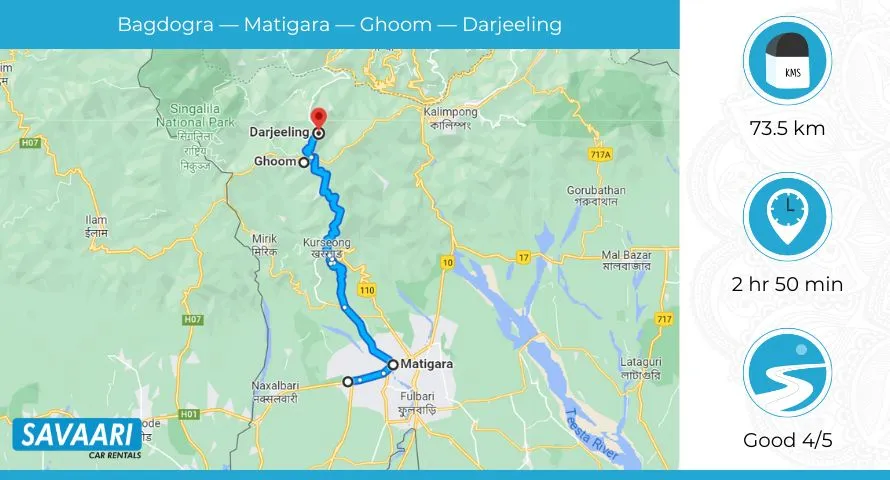 Route 1: Distance & time taken from Bagdogra to Darjeeling via NH 110