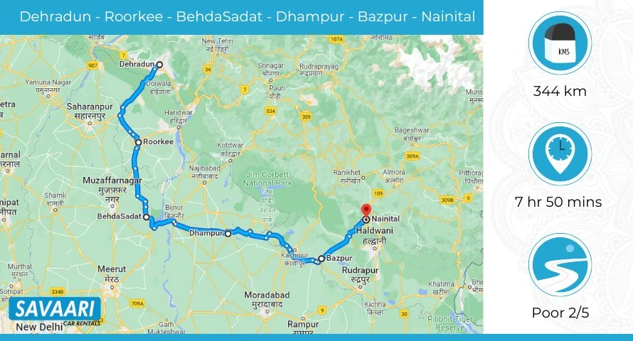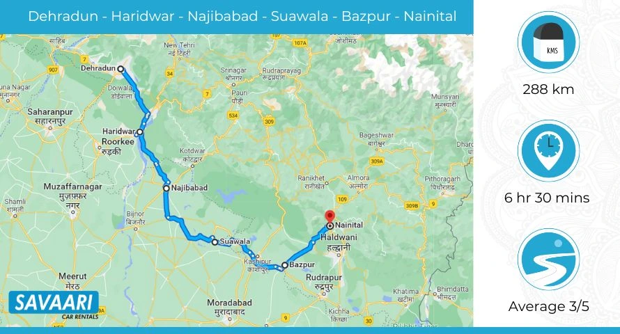 Route 2: Distance and Time taken from Dehradun to Nainital via Saharanpur Road and Nainital Road