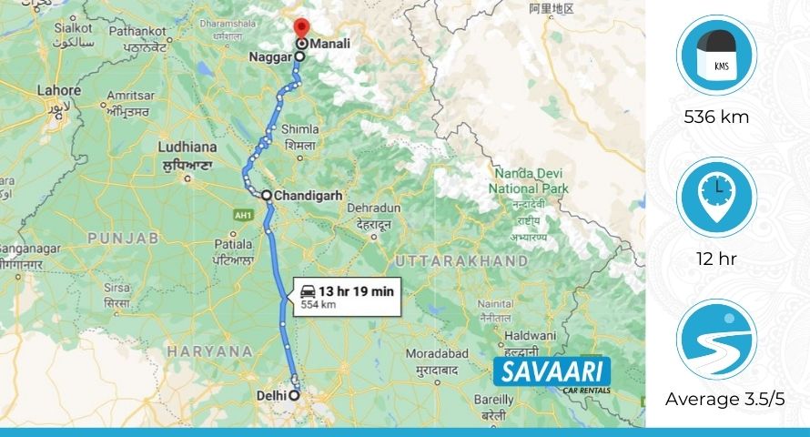 Route 2: Distance and time taken from Delhi to Manali Via NH 9