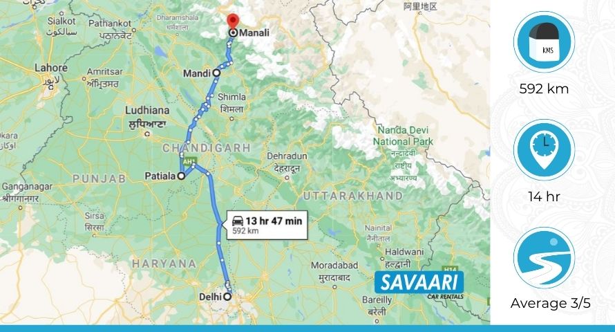 This is a longer route to travel from Delhi to Manali than the previous one and also takes a little more time. Also, the road conditions on this route are variable. The distance from Delhi to Manali on this route is around 592 KM and takes about 14 hours. To avoid road closures, always check for the latest updates and follow a live map when travelling to get the best idea of Delhi to Manali road conditions. Here’s a basic Delhi to Manali road map for this route: