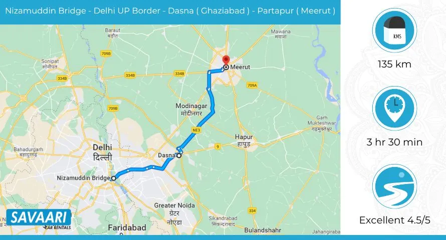 The total time taken to travel from New Delhi to Meerut by road is approximately 1.5 hours. The route is lined with various amenities such as petrol pumps, restaurants, and ATMs, making it a convenient journey.