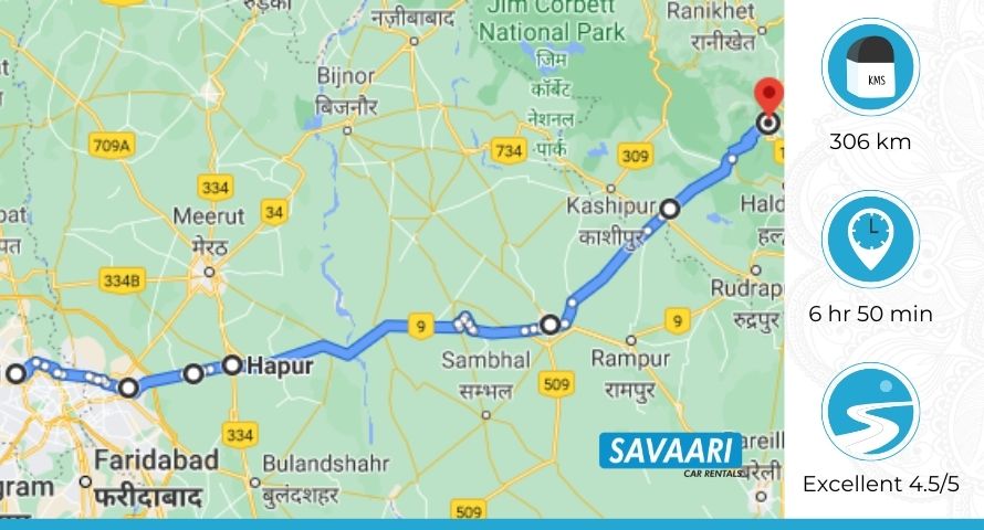 Route: Distance and Time taken from Delhi to Nainital via NH9