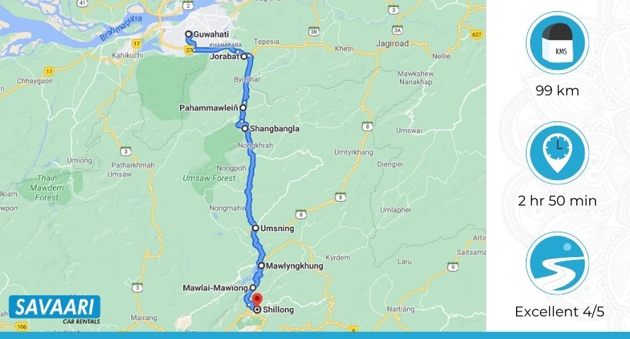 | Guwahati – Jorabat – Pahammawlein – Shangbangla – Umsning – Mawlyngkhung – Mawlai-Mawiong – Shillong |