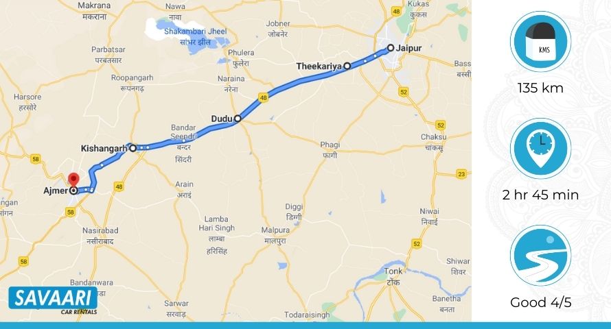 Jaipur to Ajmer Distance Via NH 48 and MDR85