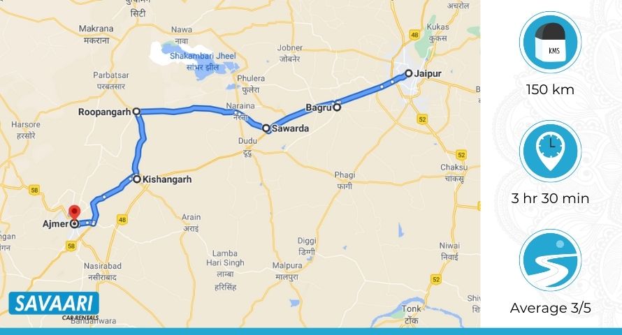 | Jaipur → Bagru → Sawarda → Roopangarh → Kishangarh → Ajmer |