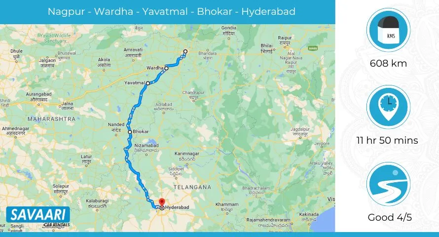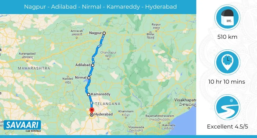 This is the shortest and the best route to travel between Nagpur and Hyderabad. The distance between Nagpur and Hyderabad on this route is around 500 KM and takes about 9.5-10 hours. Always check live maps and instant traffic updates for the latest information on Nagpur to Hyderabad road conditions.