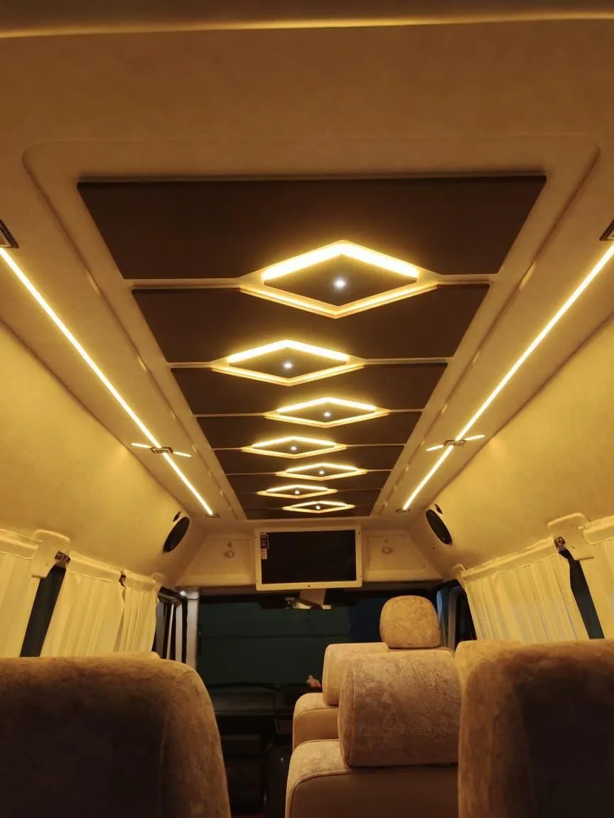 - First-class amenities: Our tempo travellers and minibuses have plush interiors, pushback seats, air conditioning, a high-quality music system, LED TV, warm lighting, ample aisle space, and first-aid kits for emergencies. Upon customer request, we also offer non-AC tempo travellers or minibuses.
