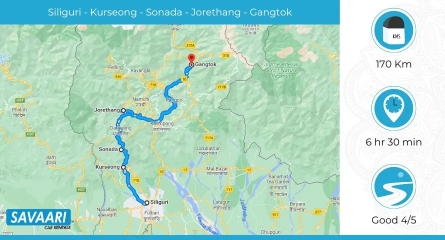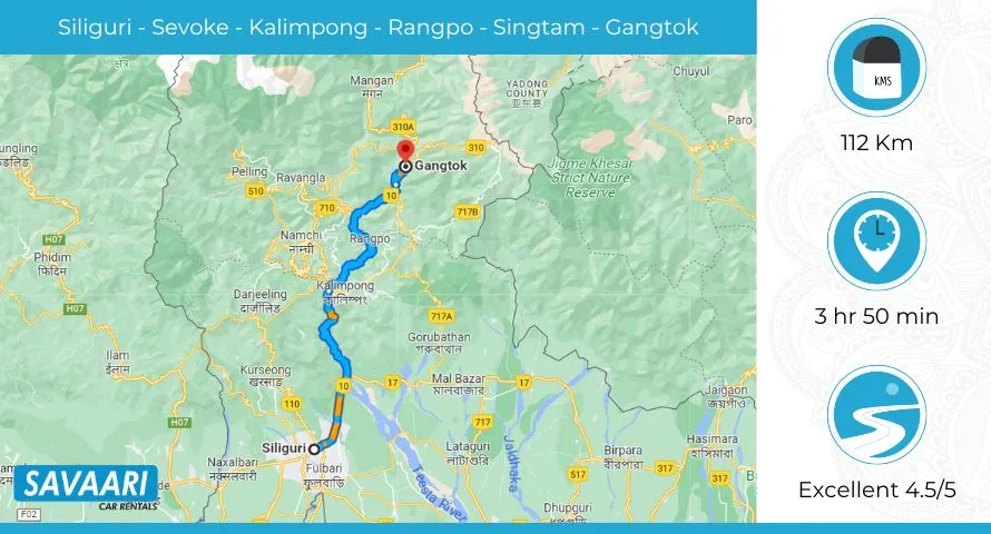 Route 1: Distance and Time taken from Siliguri to Gangtok via NH 10