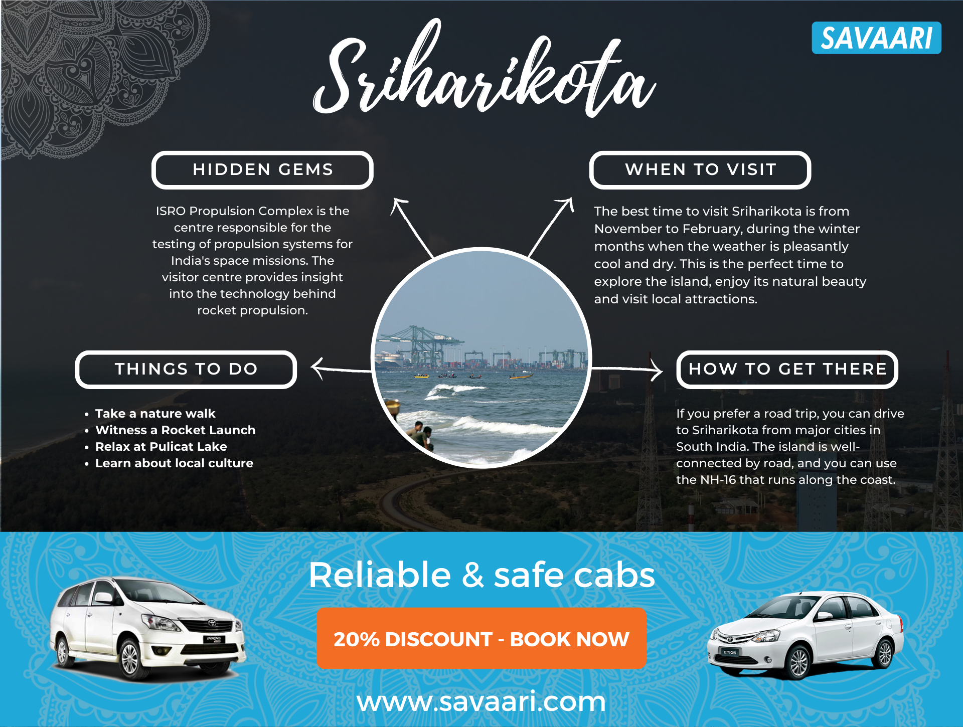 If you are planning a trip to Sriharikota, which is known for science and serenity, you should start by coordinating your visit with the scheduled rocket launches at the Satish Dhawan Space Centre (SDSC) listed on the ISRO website. Make sure you have the necessary permits for the launch viewings. You should book accommodations in nearby towns like Sullurpeta or Nellore well in advance. To explore the island’s natural beauty and culture, you should spend a few days visiting local attractions and trying the local cuisine. Keep an eye on the weather, as launches are subject to change due to adverse conditions. Before your trip, always check for any updates or changes on the ISRO website or from local sources. Also, don’t forget to download the Savaari car rental app, for a comfortable travel experience within Sriharikota.
