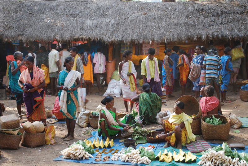 Odisha's tribal haats are the exclusive showcase for Bonda Tribe fashion. Admire their distinct style: metal necklaces, beaded headgear, colorful Ringa skirts, and intricately adorned shaven heads.